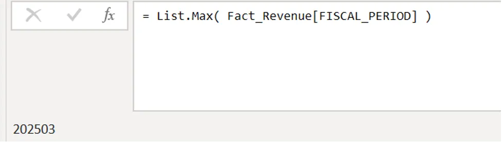MaxPeriod = List.Max( Fact_Revenue[FISCAL_PERIOD] )
