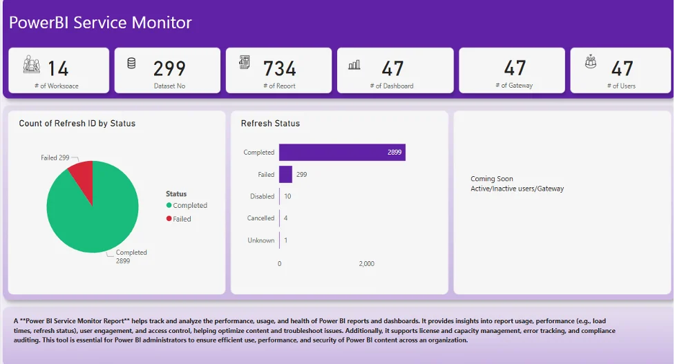 A Power BI Service Monitor is a centralized solution — often built as a report or dashboard — that tracks the health, performance, and usage of Power BI workspaces, datasets, and reports. It typically uses the Power BI REST API, Admin APIs, and activity logs to provide visibility into: